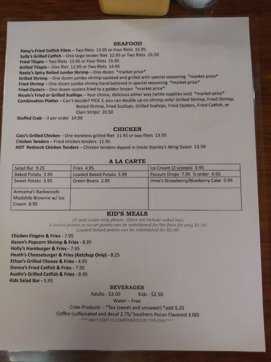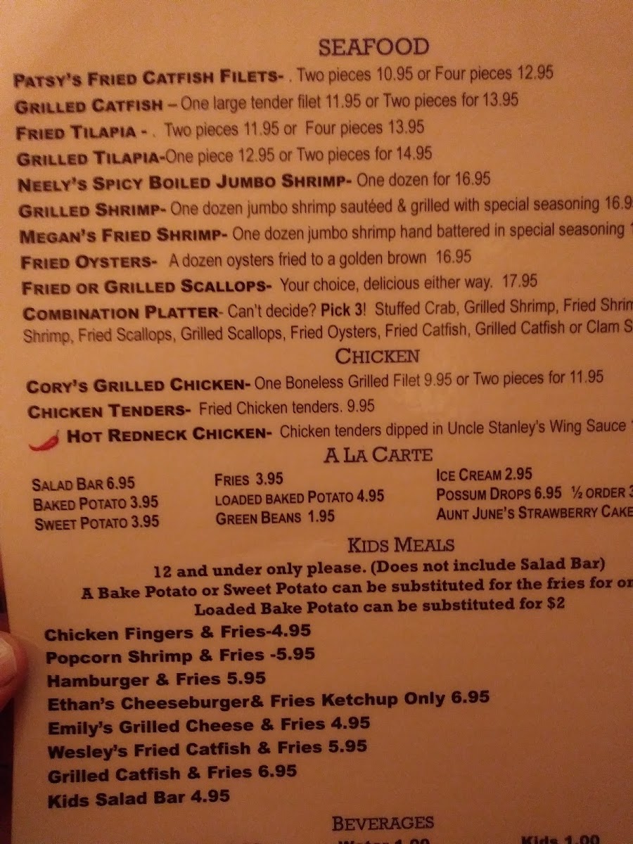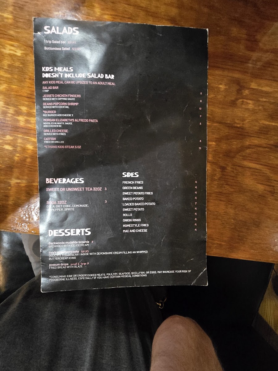 Guests can expect satisfying choices like hand-cut ribeyes, filet mignon, and a tender hamburger steak, often paired with familiar sides such as baked potatoes, sweet potato fries, or fresh salads. The seafood selections, featuring catfish, salmon, and fried oysters, complement the hearty meats and bring a balance to the menu. Simple, refreshing drinks like sweet tea and lemonade round out the experience perfectly.
