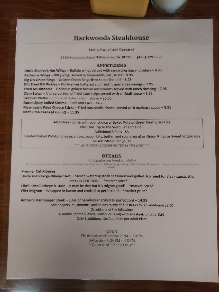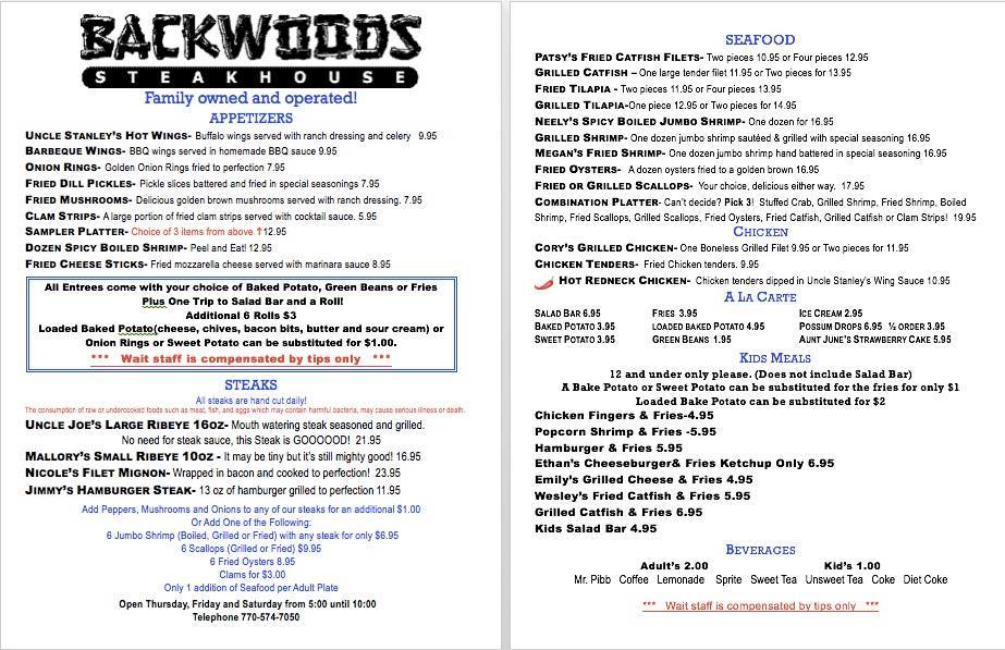 The menu at Backwoods Steak House reflects its warm, rustic setting with a focus on hearty, comforting dishes that feel right at home in a relaxed, countryside atmosphere. Whether you're settling in for a leisurely dinner or enjoying a casual meal after a day under the Georgia sky, the menu offers classic steakhouse fare alongside well-loved Southern seafood options.